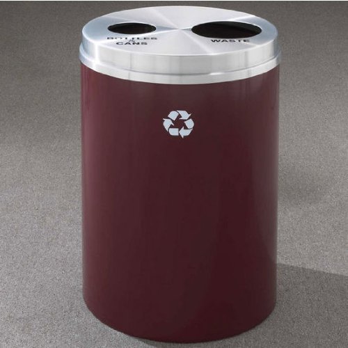 Glaro RecyclePro II Receptacle, 33 Gallon, 20 inch W, 4-7/8 inch Dia. hole & 7 inch Dia. hole, Bottles & Cans - Waste messages w/ Recycling Logo, Burgundy Finish, Satin Brass Top, Shown with Satin Aluminum Top