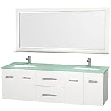 ✚✚✚ Centra Vanity Double 72" White with Green Glass Top with Square Porcelain Undermount sinks Simplicity and elegance combine in the perfect lines of the Centra vanity by the Wyndham Collection . If cutting-edge contemporary design is your style then the Centra vanity is for you - modern, chic and built to last a lifetime. Available with green glass, white carrera marble or pure white man-made stone counters, and featuring soft close door hinges and drawer glides, you'll never hear a noisy door again! The Centra comes with porcelain, marble or granite sinks and matching mirrors. Meticulously finished with brushed chrome hardware, the attention to detail on this beautiful vanity is second to none.